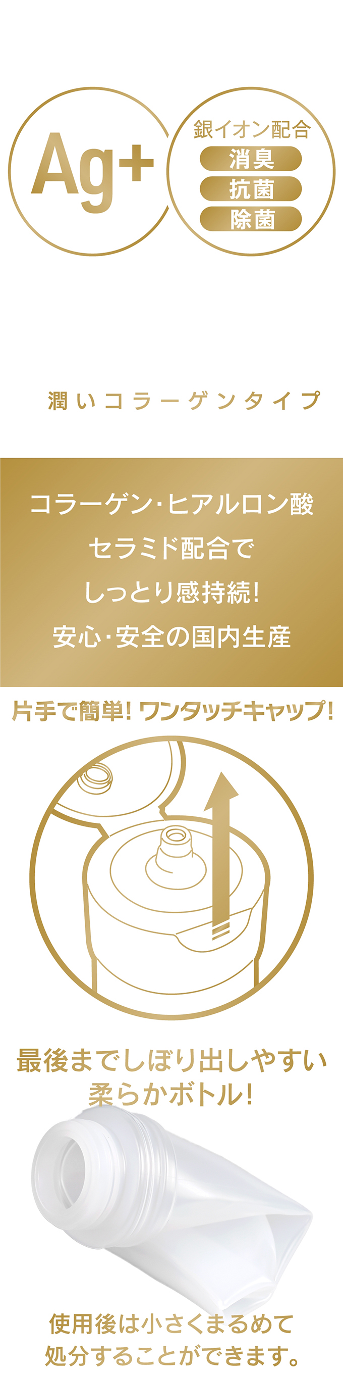 Ag+Excellent Lotion Plus 加入了新類型的同伴。保濕膠原蛋白款搭配膠原蛋白・透明質酸・神經酰胺,以持續保持濕潤的感覺。搭配銀離子可清新淨化用品,能更安全衛生地使用。濃厚但不牽絲。容器也變得更容易使用了。手即可簡單開關的瓶蓋,玩樂途中也便於補充。三孔出口的構造便於切斷牽絲。軟型瓶身方便將潤滑液全部使用完畢。空瓶可以捲成球狀丟棄。安心・安全的日本國內生產。