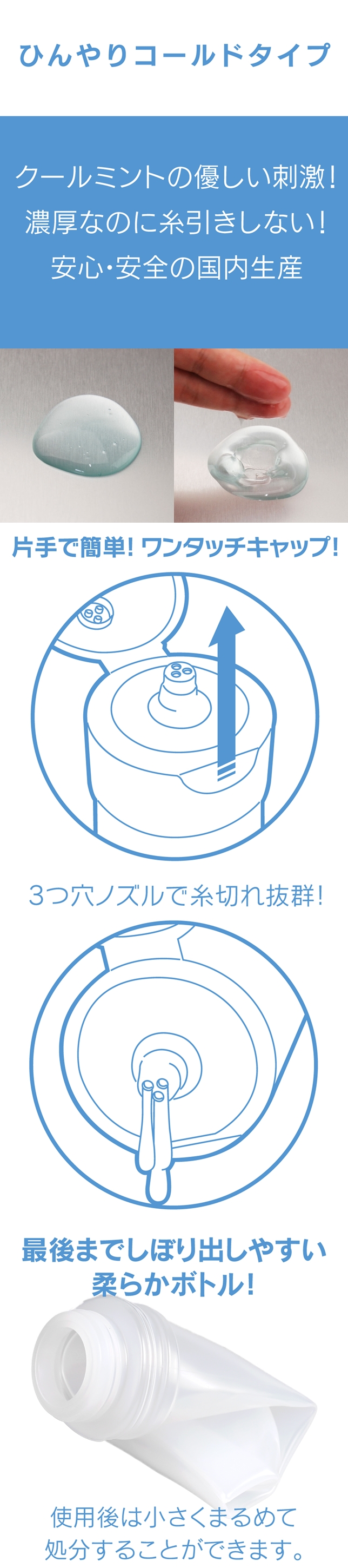 Ag+ Excellent Lotion 全新升級。搭配銀離子清新芳體,更能安全衛生的使用。沁涼Type,清涼薄荷般的冰涼刺激。另外、不會牽絲帶線。包裝瓶也設計得更好使用了。單手即可簡單打開關閉,玩樂途中也能方便使用的瓶身設計。3孔噴嘴造型可以簡單倒出。軟型瓶身方便將潤滑液全部使用完畢。空瓶可以捲成球狀丟棄。安心・安全的日本國內生產。