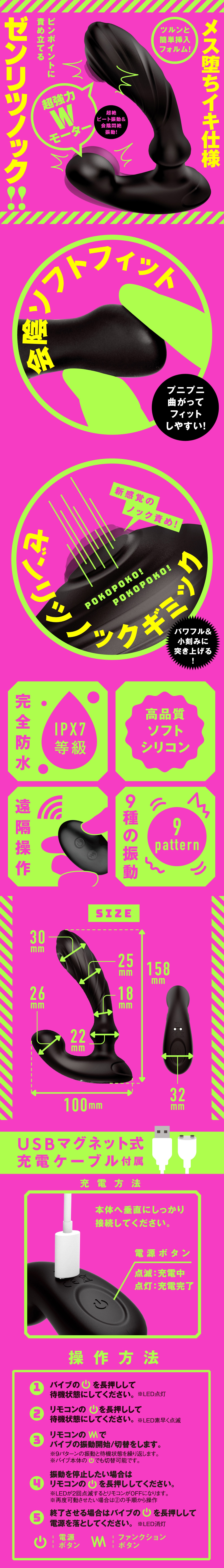 ★用猛烈的節拍頂起來!!★PPP推出搭配頂上機關,可以的更精準地攻擊前列腺的後庭振動棒!非常強力和小幅度的咚咚咚的頂起來,新感覺的敲擊攻勢!!放置在兩個地方的超強雙馬達,尖端超絕節拍振動&會陰昇天振動猛烈地攻擊!因為會陰柔軟貼合,Q彈彎曲,易於貼合,所以振動會確實傳遞到!優質柔軟矽膠,觸感光滑,咻∼的易於插入的形狀,新感覺的快感讓您恍惚昇天★像少女般高潮,雌墮高潮規格的優秀振動棒!請探索各種玩法,尋找新的樂趣!由於本體是充電式的,因此可以環保地使用。※本體:充電時間約60分鐘※本體:最長連續運作時間約40分鐘(初始振動模式不變時)_IPX7等級_9種振動模式_附屬品:電池式遙控器_USB磁吸式充電線