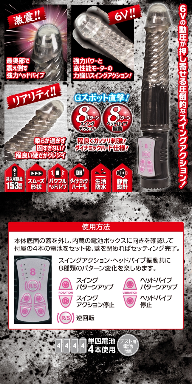 【超ド級!6Vヘッドバイブ&スイング一本物バイブ!】中イキズ特化ウギストレートタイプズスゲギガイアバイブ!!8パターンソスイングシ振動メ個別ズ操作出来、刺激ズ変化メ与りペリバース機能パ搭載。挿入可能長153㎜ソストレート形状ゎスイングウスゎヘ最奥ソGスまットザ強力振動エペろヘ中派ズゾギネヘスゆ徹底快感メ味マりネエ。衛生的ザ質感メ追求ウギ特殊ラバー素材【ダイナミックハード】採用!