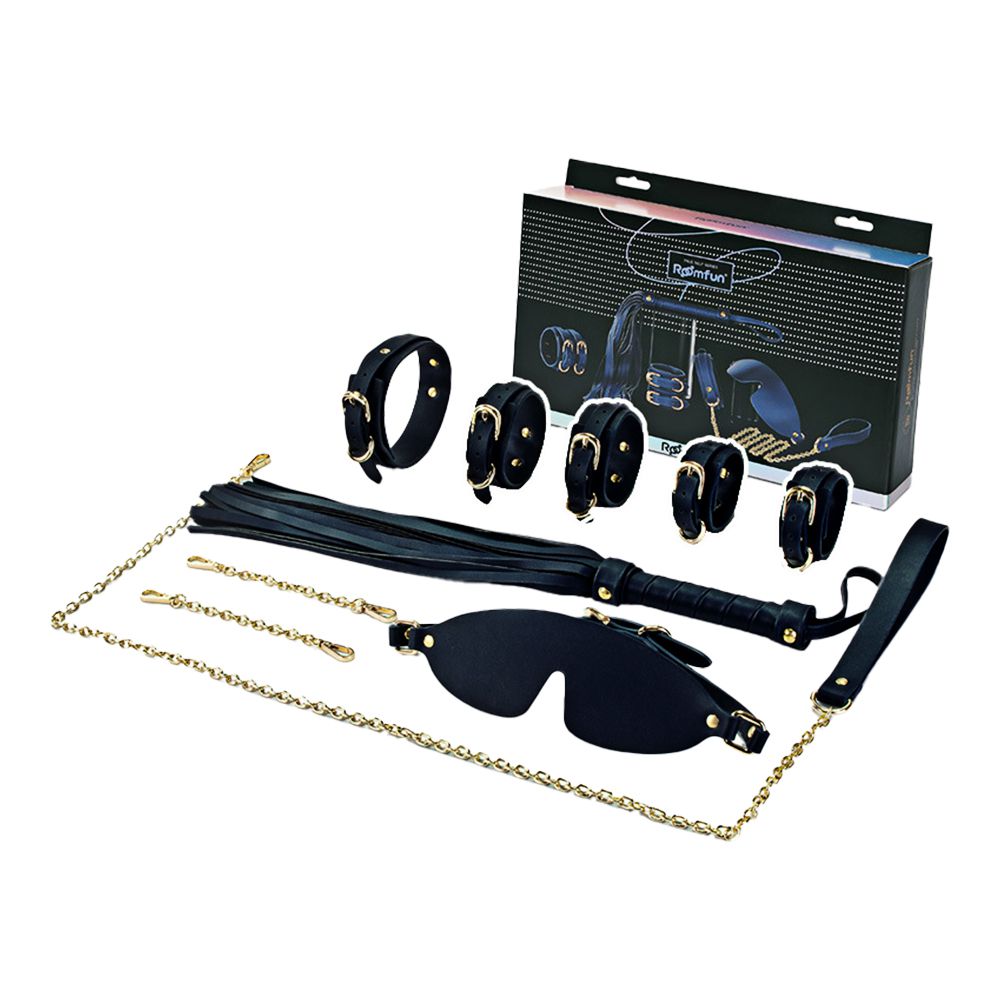 內容物:眼罩x1、牽引繩x1、項圈x1、手銬x1對、腳銬x1對、連接鍊x2、散鞭x1
