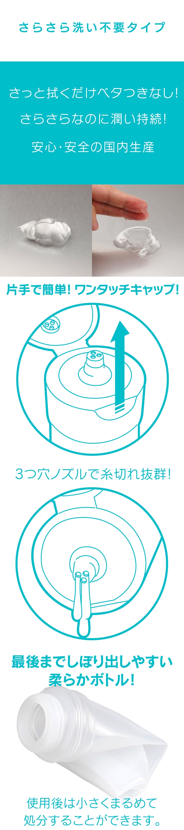 Ag+ Excellent Lotion 全新升級。搭配銀離子清新芳體,更能安全衛生的使用。濃厚Type不易乾燥,可長時間使用。此外,不會牽絲帶線。包裝瓶也設計得更好使用了。單手即可簡單打開關閉,玩樂途中也能方便使用的瓶身設計。3孔噴嘴造型可以簡單倒出。軟型瓶身方便將潤滑液全部使用完畢。空瓶可以捲成球狀丟棄。安心・安全的日本國內生產。