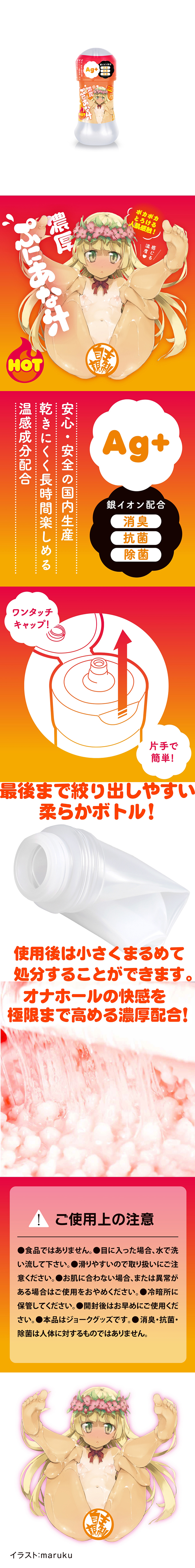 超人氣普妮安娜蜜汁的熱感款登場!搭配熱感成分,暖暖的宛如體溫般的觸感!把自慰套的觸感加持至極限的超濃厚潤滑液!獨家配方,保濕成分MAX!不易乾燥,持續保持濕度。搭配能消臭・抗菌・殺菌的銀離子,使用上更衛生。(※消臭・抗菌・殺菌對人體並無作用)單手即可簡單開關的瓶蓋,玩樂途中也便於補充。軟型瓶身方便將潤滑液全部使用完畢。空瓶可以捲成球狀丟棄。容量150ml便於使用。安心的日本國產素材&日本國內生產。插畫:maruku氏 審查編號:2201204